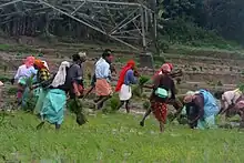 The Kambara nritham or Kambara dance is a folk dance performed by the Adiyan tribe of Wayanad, a northern district of the state of Kerala.[1] In this artform, men sing folk songs and play wind and percussion instruments, while women dance near the paddies where saplings are collected.[2]