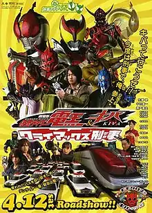 Kamen Rider Den-O & Kiva the Movie: Climax Deka (劇場版 仮面ライダー電王&キバ クライマックス刑事(デカ), Gekijōban Kamen Raidā Den'ō Ando Kiba Kuraimakkusu Deka, Masked Rider Den-O & Kiva The Movie: Climax Detectives) is a Japanese superhero tokusatsu film in the Kamen Rider franchise. Climax Deka is the second film to feature the characters of the television drama Kamen Rider Den-O and the first to feature the characters of Kamen Rider Kiva. It opened in theaters on April 12, 2008 as part of the Kamen Rider Spring Festival (春の仮面ライダー祭, Haru no Kamen Raidā Matsuri). In its first weekend, it took the top spot at the Japanese box offices,[1] unseating the Japanese release of Cloverfield.[2] In the end, it grossed 730 million yen, over double the normal revenue for a Kamen Rider film.[3] Though it is considered the first Heisei rider teamup however the story focuses more on Den-O than Kiva.