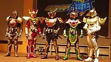 - Team Gaim (チーム鎧武, Chīmu Gaimu): Kota Kazuraba, Mitsuzane Kureshima, and Mai Takatsukasa's Beat Rider group clad in modern Happi-themed outfits.