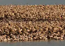 ![]() Lesser flamingos on Kamfers Dam's artificial breeding island, 2008 | |