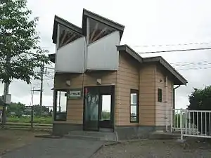 The station is located in a rural area, surrounded by rice fields. There are few buildings nearby.