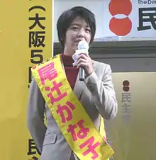 Kanako Otsuji (尾辻 かな子, Otsuji Kanako, born December 16, 1974, in Nara) is a Japanese LGBT rights activist, member of the House of Representatives for the Constitutional Democratic Party of Japan and retired karateka and taekwondoin.[1] She is also former member of the House of Councilors, and a former member of the Osaka Prefectural Assembly (April 2003–April 2007). One of only seven women in the 110-member Osaka Assembly, Otsuji represented the Sakai-ku, Sakai City constituency. In May 2013, after her party member of the House resigned, Otsuji became the nation's first openly gay member of the Diet, but her term in office expired in July. She won a seat in the 2017 general election and became the first openly gay member of the House of Representatives.