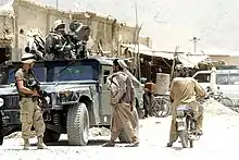 Residents of Mokhoyan, a village about 500 metres east of Camp Belamby, stated that a bomb had exploded in their vicinity on 8 March, destroying an armored vehicle and wounding several U.S. soldiers.[22] They recounted that U.S. soldiers afterwards lined many of the male villagers against a wall, threatening to "get revenge for this incident by killing at least 20 of your people", and threatening that "you and your children will pay for this".[22] One Mokhoyan resident told The Associated Press "It looked like they were going to shoot us, and I was very afraid."[22] U.S. officials from The Pentagon declared that they had "no evidence" that villagers had been lined up against a wall and threatened in Mokhoyan.[23] U.S. officials refused to confirm or deny that U.S. soldiers were wounded outside the village on 8 March.[22]