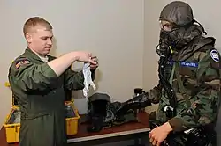 1st Lt. Ryan Cobb, 384th Air Refueling Squadron navigator, helps a Kansas Wing Civil Air Patrol cadet suit up in Mission Oriented Protective Posture gear.