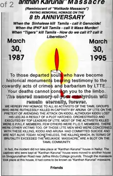 On the morning of March 30, 1987 a local area commander of the LTTE, Sathasivam Krishnakumar alias Kittu was attacked with a grenade as he was leaving his girlfriend’s home. Although the attack did not kill him, it wounded him seriously enough to warrant an amputation of one of his legs.[1] Following the attack Selvakumar Chellasamy alias Aruna, a prominent early member and a regional commander of LTTE reached the house where the detainees were held and is alleged to have killed with an AK-47 all but 2 of the detainees. The estimate of the dead ranges 40 to 63.[2][1] One of the murdered detainee was later identified as a popular medical officer with EPRLF, Raveendran alias Benjamin from Talawakelle, Sri Lanka.[3]