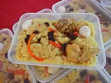 Some popular Kapampangan dishes include sisig, morcon, menudo, caldereta, estofado, embotido, asado, lengua, lechon, chicharon, afritada, bringhi (paella), tabang talangka (crab meat), the "tocino" or pindang and their native version of the longganisa. A unique Kapampangan dish that is well enjoyed by other ethnic groups is nasing biringyi (chicken saffron rice). Since nasing biringyi is so difficult to prepare, this unique Kapampangan dish can only be enjoyed during fiestas in Pampanga. It is comparable to Malaysian nasi briyani.[7]