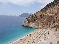 The beach is situated at a distance of 20 km from Kaş and 7 from Kalkan, at a point where an extremely narrow valley towered by steep cliffs and forests joins the sea shore in the cove of the same name as the beach (Kaputaş).[1] The beach is popular among visitors to the region due to its natural environment and views from the heights traversed by the State road D400 between Kaş and Kalkan.