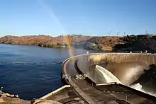 The Kariba Dam is a double curvature concrete arch dam in the Kariba Gorge of the Zambezi river basin between Zambia and Zimbabwe. The dam stands 128 metres (420 ft) tall and 579 metres (1,900 ft) long.[1] The dam forms Lake Kariba, which extends for 280 kilometres (170 mi) and holds 185 cubic kilometres (150,000,000 acre⋅ft) of water.