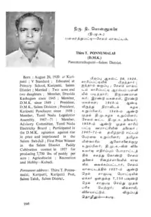 Karipatti T. Ponnumalai was an Indian politician and former Member of the Legislative Assembly of Tamil Nadu. He was elected to the Tamil Nadu legislative assembly as a Dravida Munnetra Kazhagam candidate from the Panamarathupatti constituency in the 1967 and 1971 elections. He was the member of the Tamil Nadu electric board advisory committee. He won the first prize in the Salem district paddy cultivation contest in 1957 for producing 7,750 lbs paddy per acre. He participated in the agitation by Dravida Munnetra Kazhagam against rises in price and imprisoned in a Salem subjail.[1][2]
