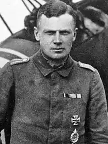 He opened his tally with Jagdstaffel 2 on 25 April 1918, as part of a huge air offensive launched to support ground assault on Kemmel Ridge.[3] He then began a steady collection of single and double victories, with five in May, seven in June, nine in July and three in August. In August, 1918, when he had scored 28 victories, he received the Military Merit Cross, and the Royal House Order of Hohenzollern; the Pour le Mérite (commonly known as the Blue Max) was bestowed on the 28th.[2]