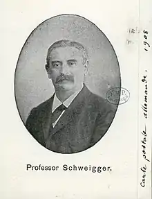 Karl Ernst Theodor Schweigger (28 October 1830 – 24 August 1905) was a German ophthalmologist who was a native of Halle an der Saale. He was the son of scientist Johann Salomo Christoph Schweigger (1779–1857), inventor of an early galvanometer.
