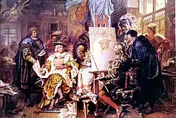 Born in Nuremberg, Jäger studied at the Munich Academy and at the Academy of Applied Arts in Nuremberg, where he later taught drawing. Between 1882 and 1886 he painted his best-known work, Maximilian I. bei Albrecht Dürer (Maximilian I with Albrecht Dürer) for the Nuremberg town hall.[1] He also helped to illustrate the works of Friedrich Schiller and created grisaille portraits of prominent personalities, including composers Beethoven and Haydn.