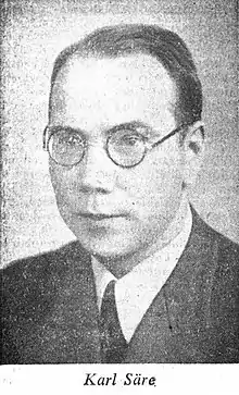 Karl Säre (July 2, 1903 – March 14, 1945) was a Soviet and Estonian communist politician. He was the first first secretary of the Central Committee of the Estonian Communist Party. During World War II, he was arrested by Nazi Germany and taken to Sachsenhausen concentration camp, where he died in 1945. The Soviet government avoided the mention of Säre's name in any public sources, as he was suspected of treason by disclosing to Nazi Germany information about the Stalinist officials and pro-Soviet agents who had remained in German-occupied Estonia during the war.[1]