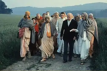 ![]() Prabhupada on a morning walk with Baron von Dürckheim in Frankfurt, 1974 | |