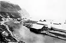 Karluk sandspit in the late 1800s showing cannery and village; the source termed the Karluk River the "River of Life" due to the dense salmon run