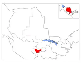 Karmana District (Uzbek: Karmana tumani, before 2003: Navoiy District)[1] is a district of Navoiy Region in Uzbekistan. The capital lies at the town Karmana.[2] It has an area of 950 km2 (370 sq mi)[3] and its population is 128,200 (2021 est.).[4] The district consists of 5 urban-type settlements (Karmana, Malikrabot, Paxtaobod, Podkoron, Kamolot, Yoshlik) and 7 rural communities (Uyrot, Doʻrmon, Narpay, Xazora, Yangiariq, Jaloyir).[2]
