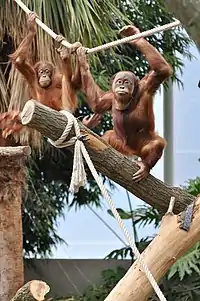 Also in May 2009, Karta made a brief escape from her enclosure at the Zoo by twisting a stick around the electrified wires and short-circuiting the fence around her.[2] A Zoo spokesman said: "She climbed over those disabled hot wires, built up a mound of leaf litter and then used a branch to climb out of the exhibit and on to the surrounding wall of the exhibit."[10] She had tried the same thing before but only to get food. She was outside her enclosure for about 30 minutes before returning peacefully.[10] Zoo officials speculated that she may have been looking for her recently deceased mate, Pusung.[11]