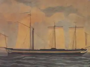 Painting showing the Karteria (centre-right, with sails down and smoke issuing from funnel) in action at the Battle of Itea (1827). Note that the Karteria is advancing under steam against the wind, in contrast with the two flanking Greek warships
