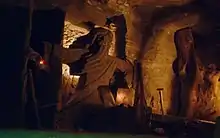 The Karzełek (diminutive of karzeł – a small one, used for describing non-fantasy dwarfs) or Skarbnyk, Kladenets (Ukrainian: Скарбник, Russian: Кладенец) (the Treasurer) or Dzedka (Belarusian: Дзедка) in Slavic mythology live in mines and underground workings and are the guardians of gems, crystals, and precious metals. It is said that they will protect miners from danger and lead them back when they are lost. They will also lead them to veins of ore. To people who are evil or insult them they are deadly, pushing them into dark chasms or send tunnels crashing down upon them. Hurling rocks, whistling, or covering one's head are actions that are offensive to Skarbnik, who will warn the offender with handfuls of pelted soil in their direction before taking serious action.[1]