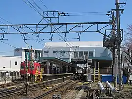 The station has one island platform and one side platform connected by an elevated station building which is constructed over the tracks and platform. The station is staffed.