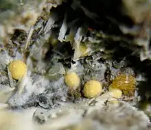Light yellow kassite's spherules with orange-yellow tabular cafetite in lizardite matrix. Base 2 mm. Locality: Val di Serra Quarry, Pilcante, Ala, Lagarina Valley, Trento Province, Trentino-Alto Adige (Trentino-Südtirol), Italy