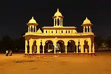 The ground generally known as KP was part of the land ceded to East India Company by the treaty of 1818. It was under the control of British army (Madras Army) for many years. It had built few building on this ground as arsenal and had stored several tons of explosive gunpowder till late 19th century. In 1880 Nagpur Civil Station municipal committee was formed and the land was handed over to the civil authorities. Kasturchand Daga donated rupees twenty five thousand for construction of an open pavilion during the exhibition in the year 1905.the Pavilion in the center of the Arsenal Ground. This was built with pale sandstone found locally and is a permanent structure destined to be a perpetual memory of the Exhibition of 1908 in days to come. The structure is light and graceful in design,characteristically Indian in its intricate arches and elaborate pillars rising one above the other to the delicate cupolas that crown the whole. It was designed and carried out by W.B Starkey, the Superintending Engineer, the finest carving being done by local skill. A marble plaque over the central arch on the southern side of the Pavilion says that the Pavilion was constructed to commemorate the Industrial Exhibition of 1908 by Diwan Bahadur Kasturchand Daga. The plaque now lies unnoticed under a layer of whitewash.[7]