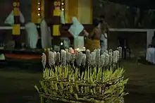 Mandappan Chekavar[4] (also spelled as Mannappan) who later became the deity Kathivanoor Veeran was born to huge landlord Kumarachan of Mangad Methaliyillam house and Chaki Amma of Parakayillam house.[5] It is said that Mandappan, a resident of present-day Mangad in Kannur district was born with the blessings of goddess Chuzali.[5] He was skilled in martial arts, and wanted to become a warrior.[6] Instead of going to work, he hunted deer and quail in the woods with his friends.[7] Although Kumarachan forbids the family from giving rice and milk to his son, who is not working, mother Chaki secretly gave him rice out of love for his son. Kumarachan gets angry when he sees this and he breaks his son Mandappan's bow.[5]