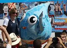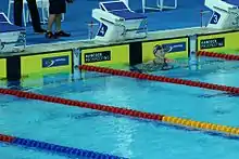 At the 2012 Summer Olympics in London, Ledecky qualified to swim in the final of the 800-meter freestyle by placing third overall in the heats with a time of 8:23.84.[33] In the final, Ledecky stunned the field, winning gold by more than four seconds, with a time of 8:14.63, the then second-fastest effort of all time just behind Rebecca Adlington's world record of 8:14.10 set in 2008.[34] In addition, she broke Janet Evans' American record of 8:16.22 that had stood since 1989. In the final, Ledecky went out hard and, by the 200-meter mark, she had already established an almost body-length lead. Her 400-meter split was 4:04.34, a personal best for Ledecky in that distance, and would have placed fifth in the individual 400-meter freestyle. At the 750-meter mark, Ledecky was 3.42 seconds ahead of Mireia Belmonte García, and 0.31 seconds under world record pace. Ledecky won by 4.13 seconds and just missed the world record by 0.53 seconds. Her gold was the first international medal of her career, earning her the 2012 Best Female Performance of the Year and Breakout Performer of the Year at the Golden Goggle Awards.