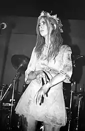 Garside has been noted throughout her career for her raucous, "carnivalesque" live performances.[56] Describing her in 1999, the Evening Standard wrote: "With her eerie voice and piercing eyes, Garside is one of the scariest women in alternative music."[4] While in Daisy Chainsaw, she engaged in spectacles such as drilling doll heads onstage and drinking juice out of baby bottles.[62] The group's raucous concerts would sometimes result in Garside performing self-mutilation onstage.[63] Russell Senior, guitarist of Pulp, recalled that at one 1989 concert in London, Garside wrapped the microphone cord so tightly around her neck onstage that she lost consciousness, and the show had to be ended early.[64]