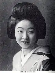 Katsutaro Kouta (小唄 勝太郎, Kouta Katsutarō, November 6, 1904 – June 21, 1974) was a Japanese female geisha and ryūkōka singer, who performed in the "New-Min'yō" style of singing.[1] Kouta came to be most well known, alongside another popular geisha singer, Ichimaru, in the "Katsu-Ichi Era".[2]