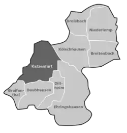 Katzenfurt is a village (Ortsteil) of the municipality of Ehringshausen. The name does not mean Katze (cat), but the name comes from the Chatten or Katten, an ancient Germanic tribe. Its first documented reference was in 1233 via Heinricus de Kaczenfurt, who was named as a witness to a sale of the estates to Grossholzheim and Kleinholzheim by Hartrad von Merenberg to Arnsburg Abbey.[2]