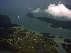 Kau Sai Chau is located south of the Sai Kung Peninsula. Its northern shore forms part of the southern limit of Port Shelter Sheltered Water, of which it is the largest island.[3] Kau Sai Chau is connected in the north by a breakwater to the smaller island Yim Tin Tsai. The southern tip of the island is separated by a narrow channel from Jin Island. It has a maximum elevation of 216 m.[4]
