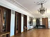 The Dukes' Hall is located in front of the Great Hall. It reused furniture and chandeliers from the old club building.[3] It is dedicated to the Grand Dukes of Lithuania and King Mindaugas. Their full-length portraits were completed in 1937 by Petras Kalpokas. After World War II, the paintings were missing for many years. They were unexpectedly found in the Vytautas the Great War Museum – removed from the frames and rolled up they were inventoried as "unknown paintings of dukes".[7] The paintings depict King Mindaugas, Grand Dukes Vytenis, Kęstutis, Gediminas (father of the Gediminids dynasty), Algirdas, and Vytautas the Great. The painting of Gediminas was severely damaged, and it is believed that Soviet soldiers used it to play darts.[6]
