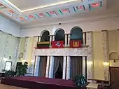 The Great Hall hosts the major events. During the Operation Bagration, in summer 1944, the Great Hall briefly served as a military hospital.[6] The interior is decorated with shields of six main branches of the interwar Lithuanian Armed Forces: Aviation, Engineers, Navy, Infantry, Artillery and Cavalry.[6]