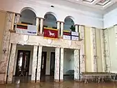 The hall has two balconies: one for the spectators and the other for the musicians. The balconies have bas-reliefs by Petras Rimša that depict four branches of the military.[3] The ceiling is 8 metres (26 ft) in height and features a coffer with tulips.[6] The white ceiling is illuminated with yellow, green and red lights – colors of the Lithuanian flag. Such lighting was installed when the building was built.[5] The columns are covered with marble, windows feature tulip motifs, and radiators are hidden by bronze grates. The black grand piano, made by Steinway & Sons in 1936, was likely gifted by the First Lady Sofija Smetonienė in 1939. Behind the grand piano, doors lead to a small winter garden that during the interwar period had a fountain.[6]