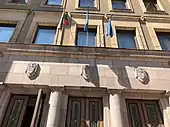 The building exterior was described as "modernized Renaissance".[5] The exterior is decorated with sculptural composition The Three Giants (Lithuanian: Trys milžinai) depicting three warriors of the Grand Duchy of Lithuania. Their shields feature the columns of Gediminas. The original sculpture survived because it was boarded up during the Soviet era.[7] Coat of arms of three cities decorate the entrance doors: taurus with a cross of Kaunas, Saint Christopher of Vilnius, and castle towers of Klaipėda. It was a clear political statement: during the interwar period, Lithuania was involved in territorial disputes with Poland regarding the Vilnius Region and with Germany regarding the Klaipėda Region. The sculpture and the coat of arms were created by Bronius Pundzius.[6] The first floor windows are covered with grates more as a decoration than for security – without them the large windows looked more like display windows.[5]
