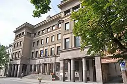 Kaunas Garrison Officers' Club Building (Lithuanian: Kauno įgulos karininkų ramovė) is a building in Kaunas, Lithuania. At construction cost of over 1.27 million Lithuanian litas, it was one of the most luxurious buildings built in interwar Lithuania. Located next to Laisvės alėja, the main pedestrian street, the building features nationalistic symbolism and decorative folk motifs.[1] The second of the four floors has four formal rooms of grand but eclectic design. Their interior pays homage to the Grand Duchy of Lithuania and was designed by prominent Lithuanian artists. Built in 1935–1937, the building served as the headquarters of the Officers' Club of the Lithuanian Army and venue for various official events. The building suffered great damage in the Lithuanian SSR (1945–1990). The Lithuanians recovered the building from the Russian Army in 1992 and it was taken over by the Lithuanian Armed Forces in 2000. In the early 2000s, the building underwent major renovation to restore and recreate as much of the authentic interwar decor as possible. In 2015, the building was one of 44 objects in Kaunas to receive the European Heritage Label.[2]