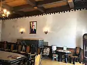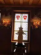 The sitting-room also has a still operational grey and white marble fireplace, decorated with authentic bas-reliefs by Petras Rimša that depict Vytautas the Great and map of the Grand Duchy of Lithuania during his reign. The bas-reliefs were saved by Rimša's nephew architect Aidas Rimša.[3] The room is also decorated with Lithuanian folk art symbols; for example, solar symbol Swastika decorates benches created by Jonas Prapuolenis.[6] The wooden floor tiles mimic design found in Lithuanian woven fabrics.[7] The walls are decorated with chandeliers made from antlers, chairs are covered with boar pelts.[6] The room has stained glass windows (originals by Stasys Ušinskas, reconstruction by Vytautas Švarlys) that depict medieval coat of arms.[3]