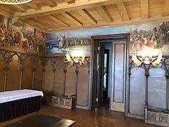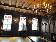 The sitting-room of Vytautas the Great resembles a medieval castle hall and is dedicated to Vytautas the Great. Its designer, architect Jonas Kova-Kovalskis, studied Gothic architecture by visiting the Malbork and Kuressaare Castles.[5] It is the most luxurious room but also suffered the most damage during the Soviet era.[6] The hall is decorated with seven murals by Jonas Mackevičius, depicting the key moments from Vytautas' life, including the victory in the Battle of Grunwald (an adaptation of Battle of Grunwald by Jan Matejko) and the Congress of Lutsk which declared him King of Lithuania. During the Soviet years, the murals were painted over (possibly on purpose to preserve from destruction by the Soviets) but they were restored in 2006.[7]