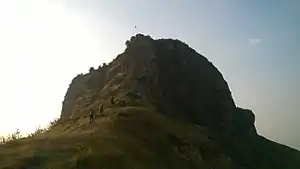The ascent to the fort follows a ridge that starts from Kavanai. The final ascent is vertical, with poor rock-cut steps crossed by a ladder.