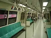 A mock-up was manufactured in Japan after Kawasaki won the contract.[23] It was shipped to Singapore and put on public display during the 1984 National Exhibition held in November 1984 at World Trade Centre.[23] The mock-up featured three choices of seating arrangements and colour schemes; members of the public were invited to give feedback on these options.[23] The finalised interior design of the C151 trains consisted of a fully longitudinal seating arrangement.[24] The bucket seats were made of plastic; glass partitions separated the seating areas from the passenger doors.[24] Strap lines for standing passengers were installed in the middle of every car.[24] The colour scheme of each adjacent car's interior is distinct to make car identification in cases of fault reporting easier for passengers.[24] Originally the colour scheme of the driving trailer cars was orange, that of the second and fifth motor cars was blue, and that of the two centre motor cars was green.[2] There were nine seats between two doors; this was reduced to seven after the first round of refurbishment.[24]