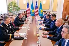 On December 10, 2014, U.S. Secretary of State John Kerry and Kazakhstan's Foreign Minister Erlan Idrissov co-chaired the third meeting of the Strategic Partnership Dialogue in Washington, DC.[42] The two sides highlighted the robust and growing bilateral ties between Kazakhstan and the United States.[42] The wide-ranging discussions on bilateral and regional issues in the Strategic Partnership Dialogue included the following: partnership on global issues; nonproliferation; democracy, human rights, and development; trade, investment, and energy; Afghanistan and regional integration; security and law enforcement cooperation; military cooperation; education, science, and technology partnership; development in humanitarian assistance; EXPO-2017.[42]