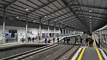 Kebumen Station has five train lines. At first, line 2 was a straight line. Lines 4 and 5 were dismantled in 2014 because they still used small rails and were rarely used. After the double track was operated from this station to Wonosari Station as of 14 December 2019 and then following the completion of the rebuilding of the Renville Bridge as of 5 May 2020, the emplacement of this station was slightly overhauled and extended to the southeast. Line 2 was used as a straight track towards Kroya only, line 3 was used as a straight track towards Kutoarjo, and lines 4 and 5 were completely rebuilt. The overcapping roof that covers all the tracks at this station has been replaced with a new one and is bigger in size. The station platform has also been extended and raised so that it can accommodate long series of trains and makes it easier for passengers to get on and off the platform. The old station building has been preserved because some of the buildings, such as the blinds window in front of the station, are still original.[4][5] In addition, the old electric signaling produced by Westinghouse Rail Systems which has been in operation since 1999 has been replaced with the newest one produced by PT Len Industri.