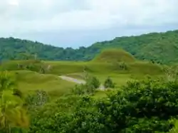 Ked Ra Ngchemiangel, also known as the Kamyangel Terraces, are a series of sculpted landforms in Aimeliik, a state on the island of Babeldaob, the largest in the island nation of Palau. Located near the Kamyangel River near its entry into Ngchemiangel Bay, the terraced hills are clearly manmade forms created in unknown antiquity, and are arrayed in a curve overlooking the bay.[2] When viewed from head-on, many of these terraces have a stepped "crown and brim" appearance similar to that of a brimmed hat. One of the hills is terraced to a height of 190 feet (58 m).