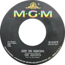 In 1965, the song was covered by The Gentrys.[3] The Gentrys' version was first released on Youngstown 601 in 1965, but was soon nationally distributed by MGM Records.[4] "Keep On Dancing" is notable for the fact that it is actually one short recording repeated in order to stretch the record out to the length of the typical pop single of its day. The second part of the song (after the false fade, beginning with Gentrys drummer Larry Wall's drum fill) is the same as the first.[5] Although the Gentrys usually had Jimmy Hart and Bruce Bowles as singers, the band's guitarist, Larry Raspberry, sang lead vocals on the song.[6]