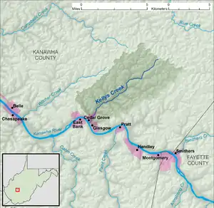 Kellys Creek is a tributary of the Kanawha River, 6.5 miles (10.5 km) long,[3] in West Virginia in the United States. Via the Kanawha and Ohio rivers, it is part of the watershed of the Mississippi River, draining an area of 24.7 square miles (64 km2)[4] in a coal mining region on the unglaciated portion of the Allegheny Plateau.