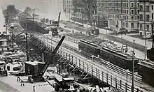 Bus service to Kenmore began in 1933 as replacement for the Ipswich Street line.[13][14] Buses originally stopped at the curb, which required them to cut across multiple lanes of traffic to loop from inbound to outbound. In early 1939, the Chamber of Commerce proposed a busway in the center of the square, with direct access to the station mezzanine below.[15] Mayor Maurice J. Tobin initially supported the plan, but soon refused to allow the city to pay for it.[16][17] The proposal was raised again in 1943, and Tobin awarded a $24,063 contract on June 28.[18][19] The busway, which had a concrete platform and a wooden shelter, opened along with a direct stairway to the mezzanine on November 4, 1943.[20][21]