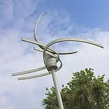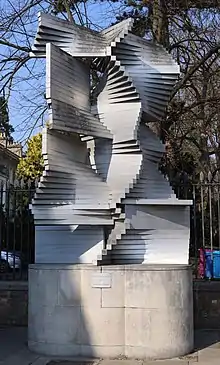 Kenneth Martin's "Screwmobile" of 1953, with its brass strips mounted in helical form, is considered a particularly representative example of that approach.[8] Later static constructions with implied kinetic rhythms included the small standing "Oscillation" at the Whitworth Art Gallery[9] and the monumental "Construction in Aluminium" for the Cambridge University Department of Engineering,[10] both dated 1967. As he was theorising at the time that he created these works, "An organized series of events, which the constructing process becomes, defines the whole character of a work. The mental and the physical are tied together in the succession of events. So that practical things, through the understanding of their nature, can result in an imaginative edifice."[11] Diversifying from such works, he developed his adjustable "Rotary Rings" (1968) and the curved narrow blades of his motorised "Kinetic Monument" (1977).[12]