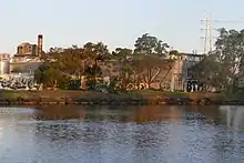 In the late 1850s, the City of Melbourne moved its cattle yards from a location on the corner of Elizabeth and Victoria Streets to a location in the north of the suburb, near present-day Racecourse Road.[3] The yards were completed in 1858, with the first sales held the following year.[3] The yards' proximity to the Maribyrnong (or Saltwater) River, allowed for the discharge of liquid waste and were soon joined by factories for fellmongery, bone manure, and glue.[4]