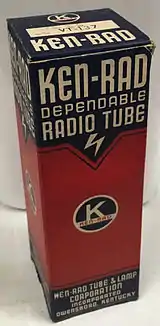 Founded in 1899, the Kentucky Electrical Lamp Company began operations at 817 Lewis Street (later renamed J. R. Miller Blvd., in the 1980s) in Owensboro, Kentucky.[1] The company was sold to Roy Burlew in 1918 who used it to create the Kentucky Radio Corporation, later known as Ken-Rad, which operated out of the same building. Burlew grew the company significantly as the lamp plant continued to grow, Burlew expanded into the manufacturing of vacuum tubes for radios in 1922. Within seven years of purchasing the company it had expanded with plants in Bowling Green, Kentucky and Tell City and Huntingburg, Indiana.[2] The manufacturing company supplied the light bulbs for the first Major League Baseball game played at night. The game was played on May 24, 1935, between the Cincinnati Reds and the Philadelphia Phillies at Cincinnati's Crosley Field.[3] In 1943, Burlew sold the lamp division which he acquired in 1918 for $55,000 to the Westinghouse Electric Corporation in exchange of 35,000 shares of that company's stock valued at $1,600,000.